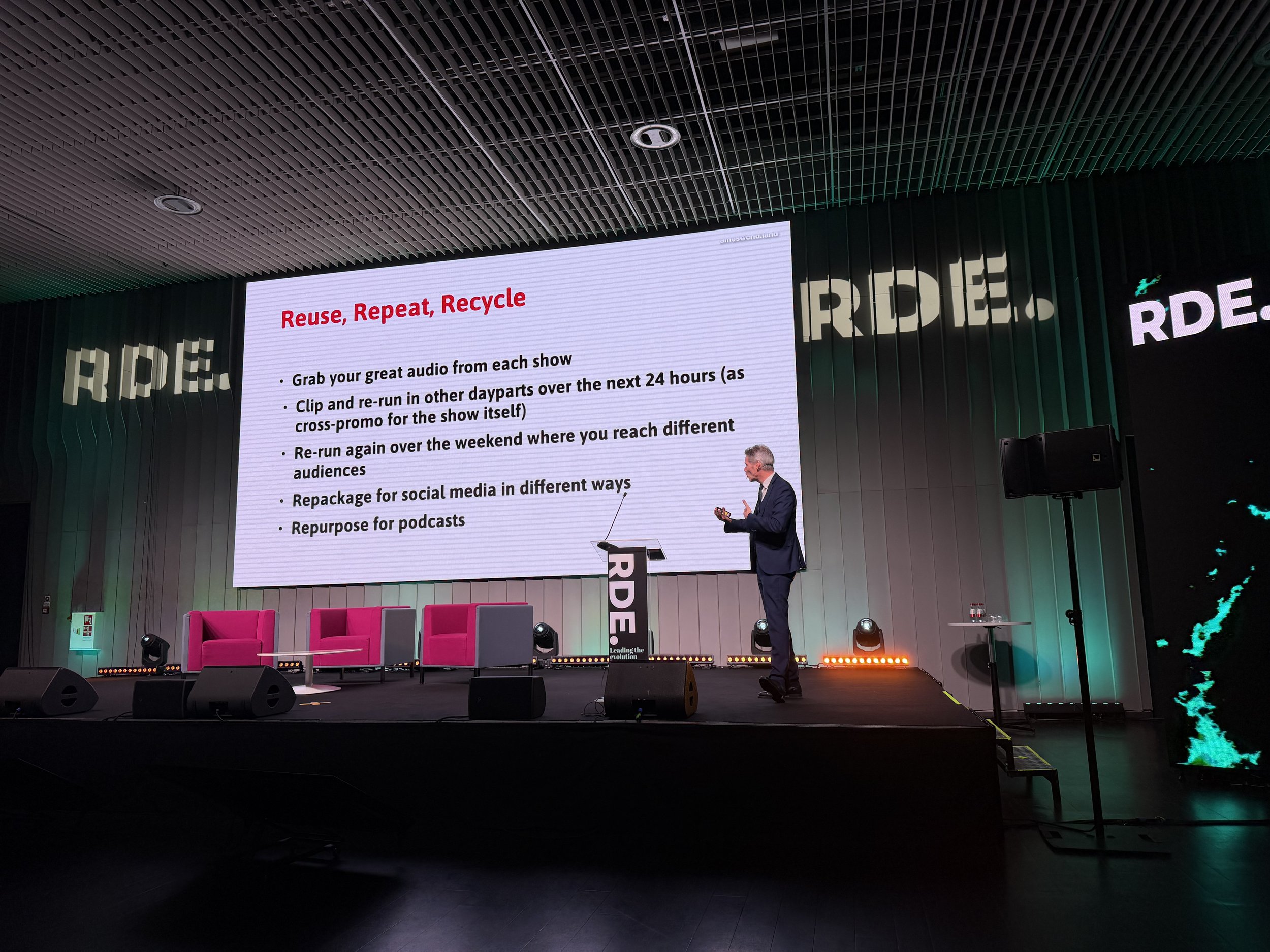 Auch der Umgang mit Inhalten muss sich ändern. „Spoken word is expensive“, sagt er – und meint damit: Gute Inhalte dürfen nicht nur einmal laufen. Sie müssen weitergedacht werden, in andere Slots, auf andere Plattformen, in andere Formate. Zumal die Leute uns nicht rund um die Uhr hören, obwohl wir rund um die Uhr senden., Beispiel: BBC Radio 2 wird im Schnitt elf Stunden pro Woche gehört. Klingt viel, bedeutet aber auch, dass ein Großteil des Tages ungenutzt bleibt. Genau dort liegt die Chance, Inhalte zu verlängern und Wirkung zu verstärken.